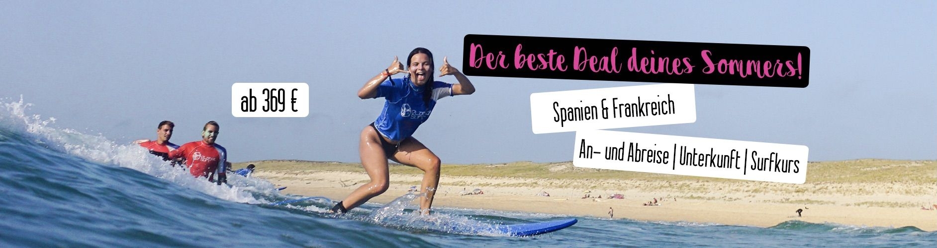 Surfcamp Deals Sommer 2019 - Unschlagbar günstig nach Frankreich und Spanien in den Surfurlaub Hier bekommst du einen Überblick über all unsere Superdeals für unsere Erwachsenensurfcamps in Frankreich, genauer gesagt Vieux Boucau, Moliets und Le Pin Sec , und San Vicente de la Barquera in Spanien.